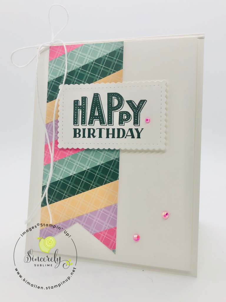 I love the new in-colors, they’re bright and fun and the names make me smile. To make the banner, I just cut a long 2″ strip of Basic White cardstock. If I had to guess a length, I’d go with 8ish inches so that you have enough covered to be able to trim it to the needed length. I cut 1/2″ strips of all the colored dsp strips and attached them to the long strip of Basic White. I cut the end into a banner and attached it to a white layer before attaching it to the card. I love the white space, it makes the Polished Pink gems stand out.