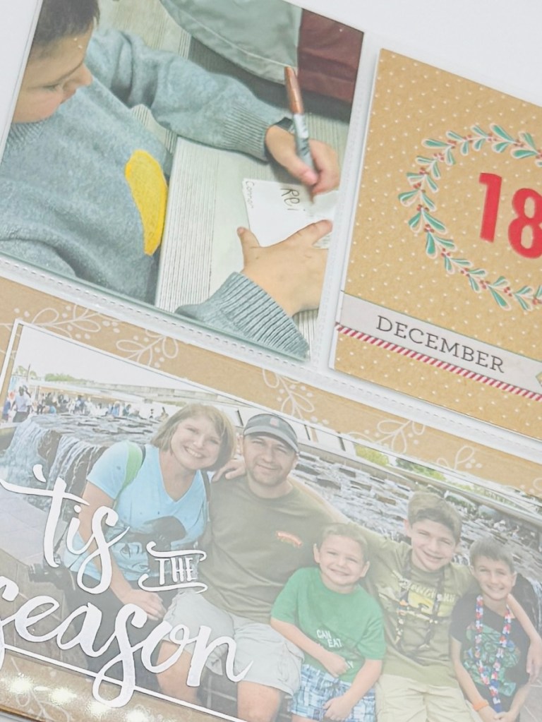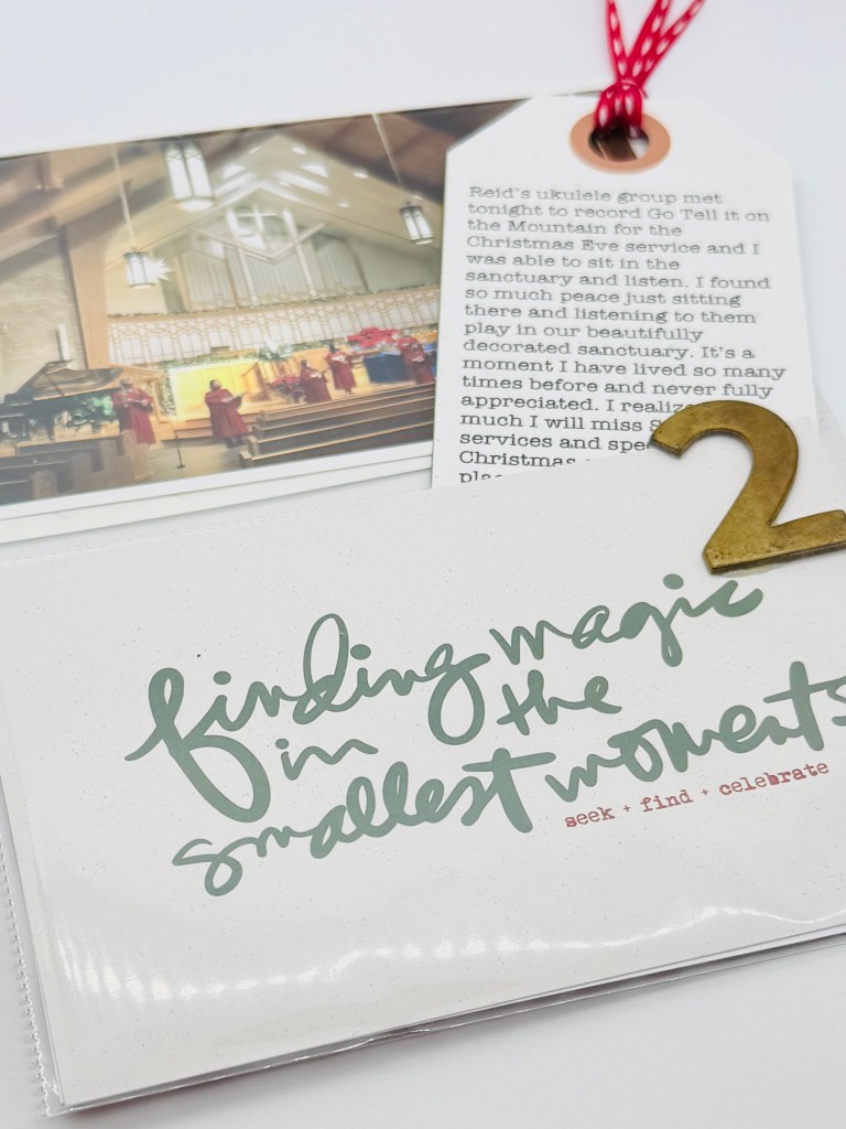 This page is one of my favorites. If all I had was the photo, I would not remember how I felt when I took it. The story is on the tag and is from 2020. Reid’s ukulele choir had just rehearsed and recorded a song to be included in the virtual Christmas service due to the pandemic. I sat in the sanctuary that night overcome with the sadness that I would not be celebrating Christmas in this place with the people who I see as family. It was a sad moment and I realized how much I had taken that opportunity for granted every year. This layout is one of my favorites due to the simplicity. It’s a 6×8 pocket page with room for a 4×6 in the top and another in the bottom. It’s so easy to put the photo in one pocket, embellish the bottom pocket and include a tag for the story that can be pulled out and read.