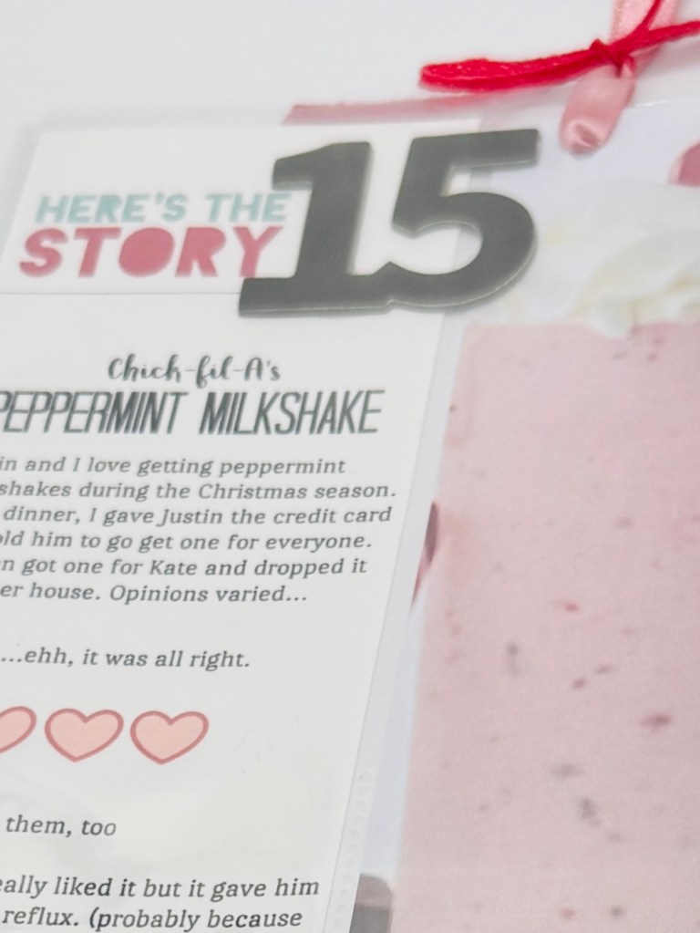This page was a fun one. It was a picture of Chick-fil-a’s Peppermint Milkshake on the right with everyone’s opinions on the left side. We picked up milkshakes one night and I wrote down everyone’s thoughts.
