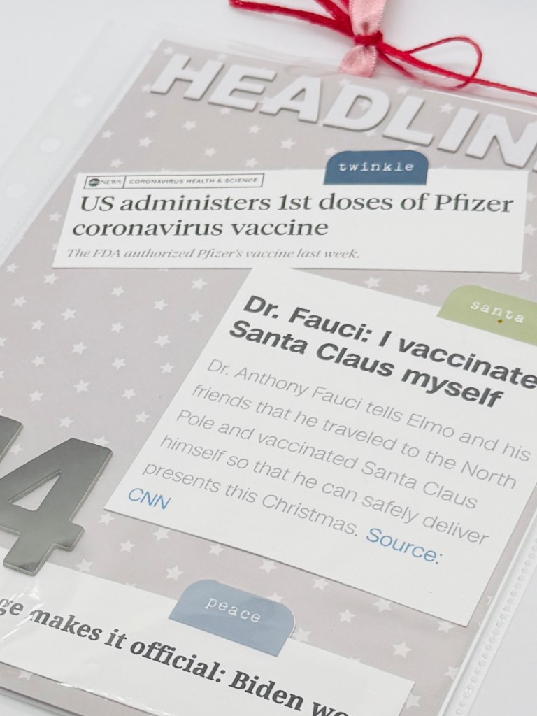 Your pages can be personal stories or you can add in pages with what’s going on around you. I like this page because it is another one from 2020. I thought it would be neat to look back on some of the headlines that were in the news.