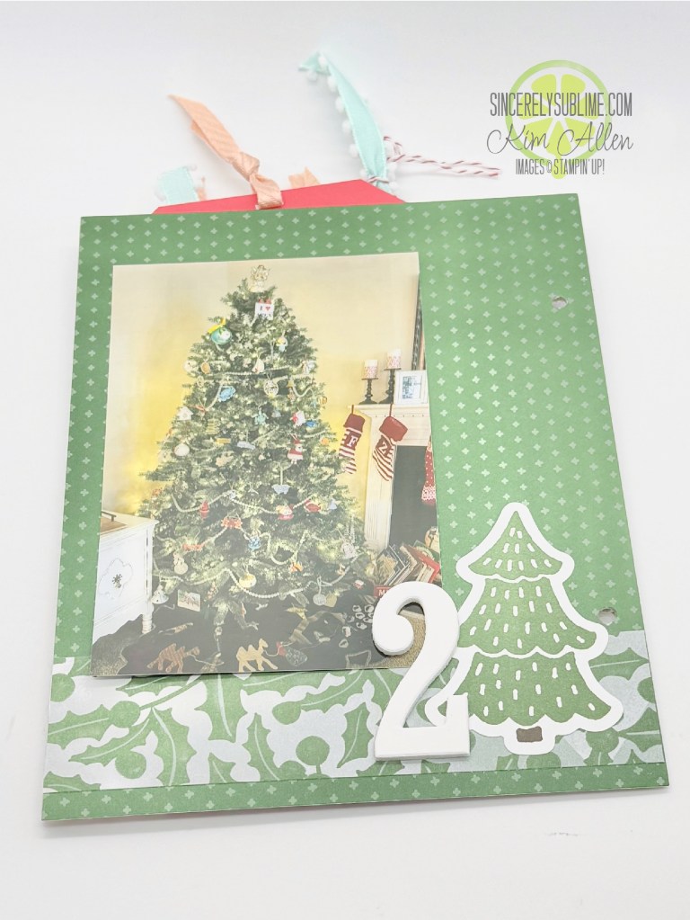 The pocket page is a fun way to display more than one photo without having to print them too small. To create this page, I simply took the cardboard from a specialty pack of DSP and cut it down into a 6″x 8″ piece. I then covered the front and back using DSP. For the front, I covered it with the candy cane print. To make the pocket, I cut a layer of window sheet into a 4″ x 6″ piece and then attached to the page using a piece of tear and tape across the bottom and down the right side. I left the left side open so that there would be room for give and the pocket wouldn’t be too tight. I used a hole punch to put two holes right where the binder rings go through. Since one of the holes incorporates the window sheet, it will keep the tags from falling out of my book.